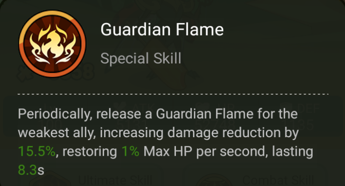 Every once in a while, release a Guardian Flame for the weakest friend, increasing their damage reduction effect by 15.5% and restoring 1% of maximum life per second for 8.3 seconds.