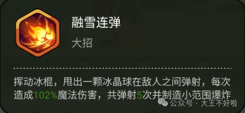挥动冰棍,甩出一颗冰晶球在敌人之间弹射,每次造成102%魔法伤害,共弹射5次并制造小范围爆炸