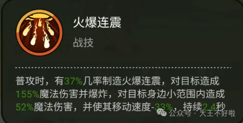 普攻时,有37%几率制造火爆连震,对目标造成155%魔法伤害并炸,对目标身边小范围内造成52%魔法伤害,并使其移动速度-33%,持续2.4秒
