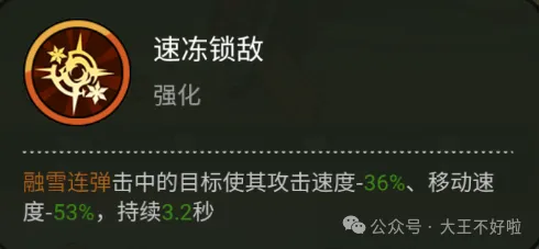 融雪连弹击中的目标使其攻击速度-36%、移动速度-53%,持续3.2秒。