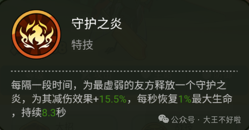 每隔一段时间,为最虚弱的友方释放一个守护之炎,为其减伤效果+15.5%,每秒恢复196最大生命,持续8.3秒。