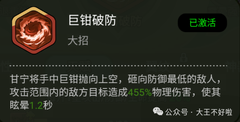 (甘宁的大招是范围眩晕伤害,基本稳定打后排,此时如果敌人聚集在一起,伤害会更高哦)