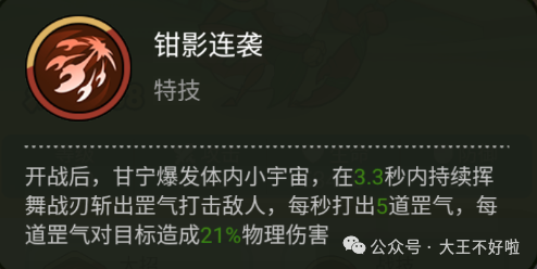 (保证了甘宁的先手权,如果输出高,可以达到开战对面就残血,快速减员,并且可以给甘宁回能,早点放大招。)