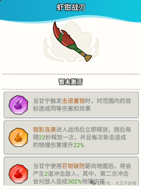 神器点评:甘宁的核心是大招范围和脑晕,只有红色神器才可以解锁大招的伤害而燚色神器可以让甘宁做到范围击退和真伤。
